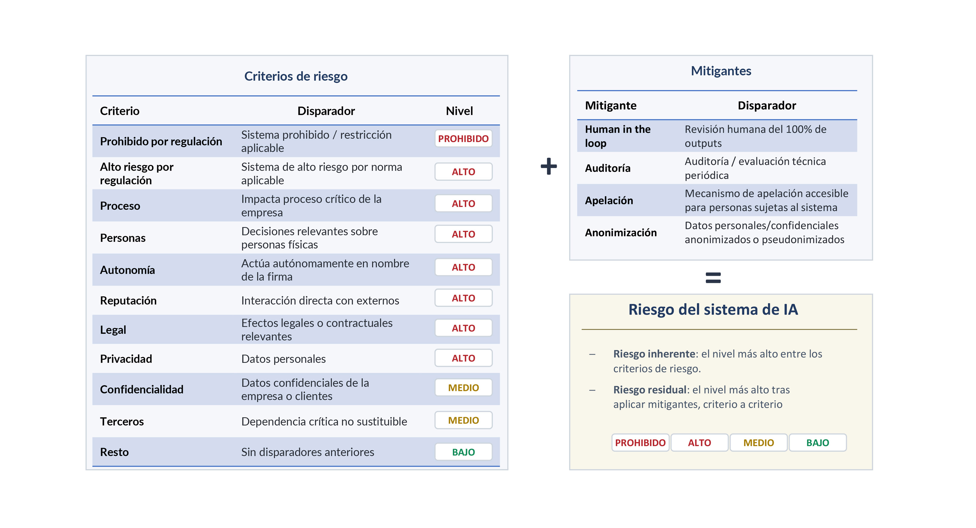 Por ello, las organizaciones convergen hacia clasificaciones de riesgo de la IA internas más exigentes, que integran criterios regulatorios con propios: impacto reputacional, criticidad del proceso, clasificación de ciberseguridad, tier del modelo según validación, impacto financiero directo, madurez de proveedores, etc. Un sistema puede no ser alto riesgo regulatorio, pero sí serlo internamente si afecta a procesos críticos o genera una exposición reputacional masiva (Fig. 4).