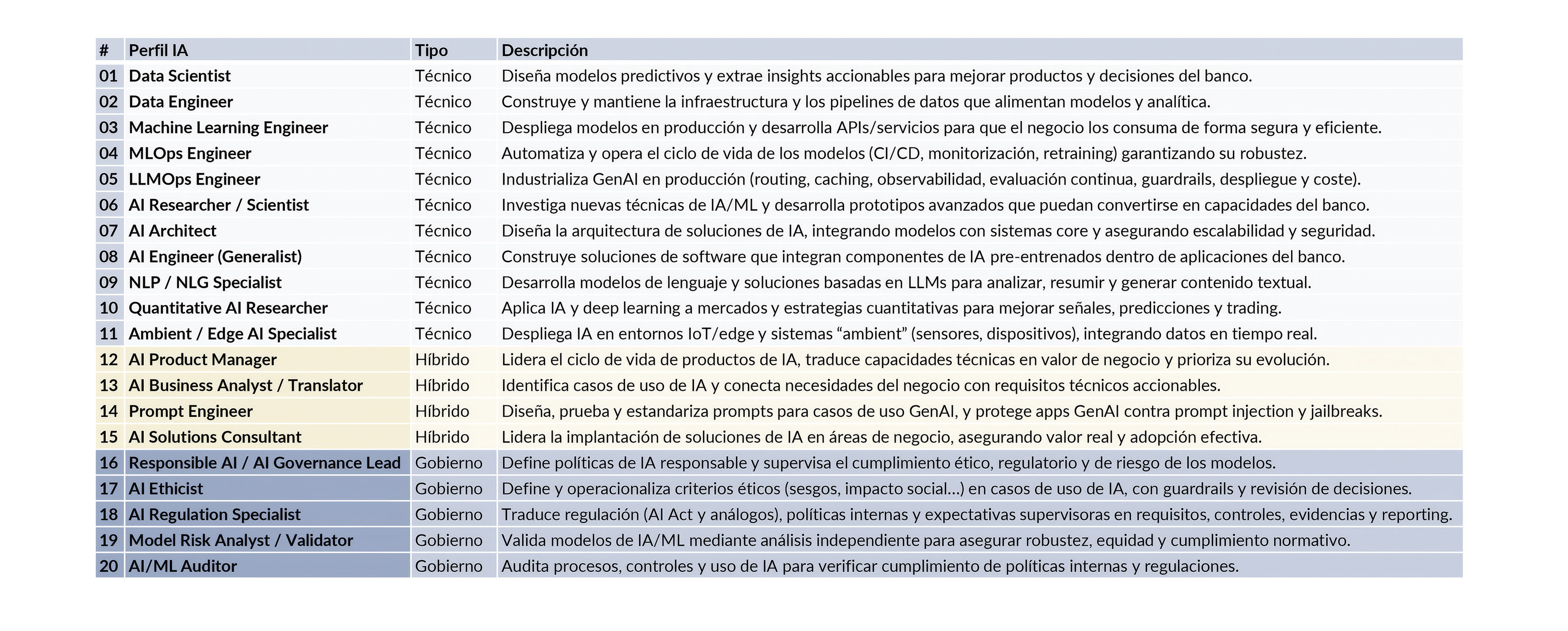 A medida que la IA madura, las organizaciones convergen hacia un conjunto relativamente estable de competencias y capacidades profesionales. Aunque la nomenclatura varía entre sectores y empresas, las funciones que desempeñan estos perfiles comienzan a ser homogéneas. Sin embargo, los roles formales son menos que los skillsets subyacentes: en la práctica, un mismo profesional combina varias de estas capacidades, y las combinaciones más inusuales (quien domina a la vez LLMOps, regulación y prompt engineering, por ejemplo) son precisamente las más valiosas y escasas. Esta convergencia refleja una realidad operativa: el ciclo de vida de la IA (desde los datos hasta la producción y el control) requiere capacidades diferenciadas que no pueden concentrarse en un único tipo de profesional.