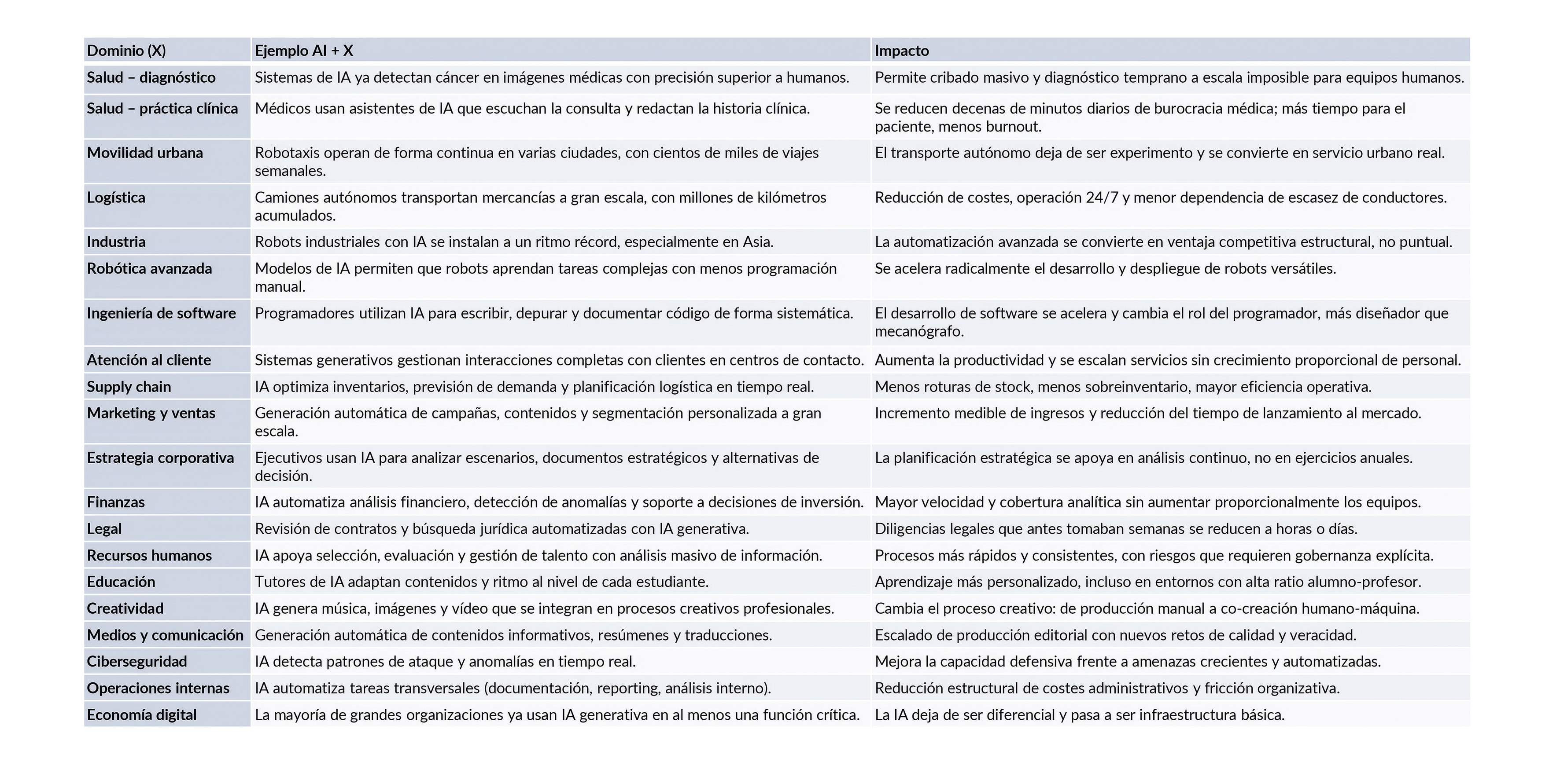 Más allá de los ejemplos sectoriales, la evidencia converge en un punto central: la transformación actual no reside en la adopción aislada de IA en sectores concretos, sino en su integración simultánea y transversal como infraestructura operativa y cognitiva. Los estudios coinciden en que la ventaja competitiva ya no se obtiene aplicando IA a funciones individuales, sino integrándola de forma coherente a lo largo de toda la cadena de valor. En este sentido, AI + X no describe ya una moda terminológica, sino un patrón estructural de transformación. Comprender esta lógica resulta esencial para anticipar impactos sectoriales, diseñar políticas públicas adecuadas y definir estrategias organizativas capaces de capturar el valor de la IA de manera sostenible.